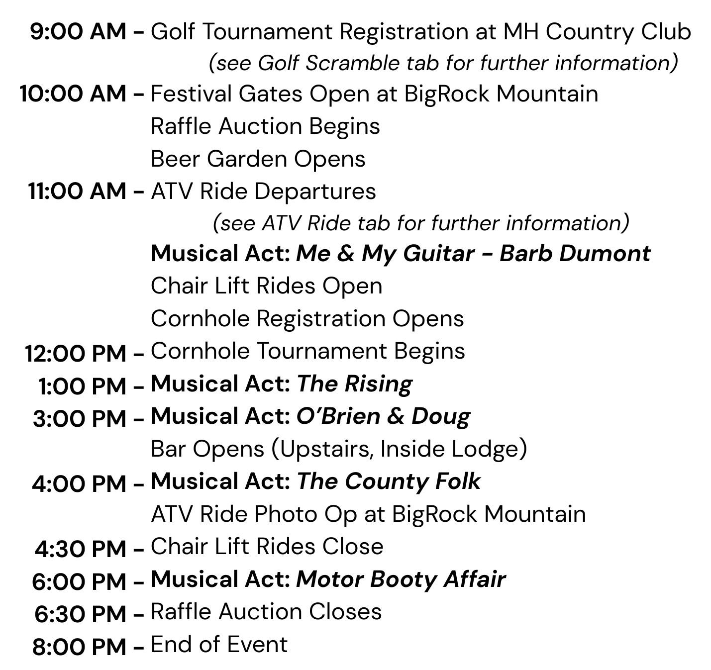 What better way to spend the day than at a Music Festival at the base of Big Rock Mountain! Enjoy the amazing fall foliage on the brand-new chairlift, great musical acts, bonfire, food trucks, beer garden, golf tournament, AND an ATV group ride in. A great deal for a great cause!
